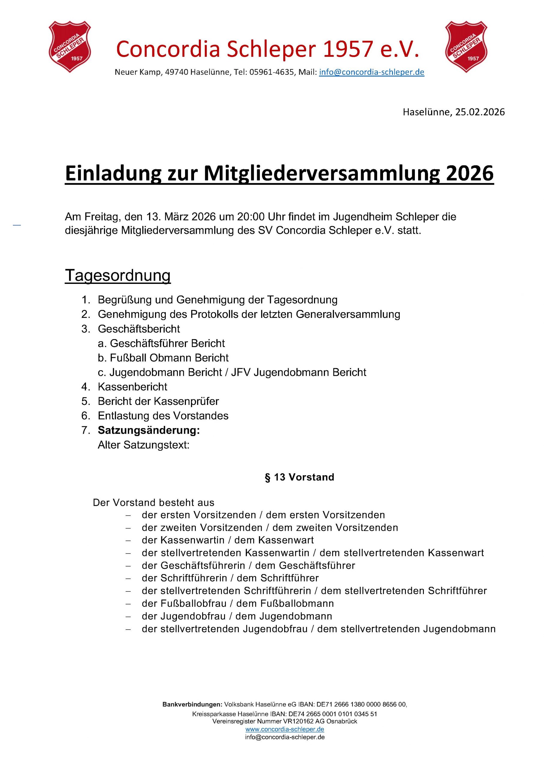 Am 13.03.2026 um 20:00 Uhr findet die diesjährige MItgliederversammlung im Jugendheim Schleper statt.